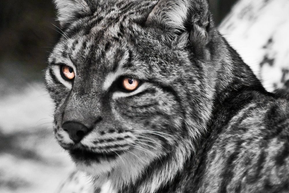 About "Coquettish lynx with glowing eyes half-turn because of crying on a cold snowy background contrasting"