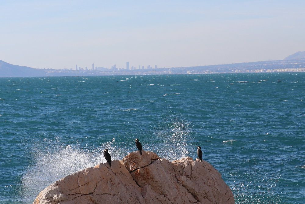 Cormorants dry their birds on rock near Calp with background Benidorm.