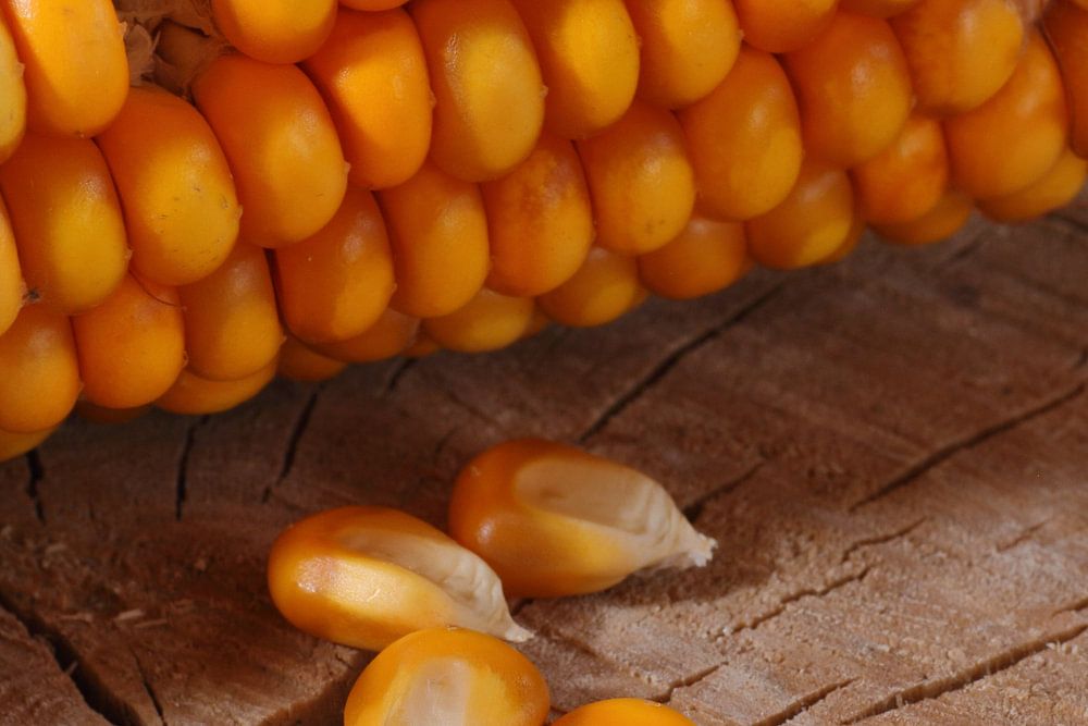 Corn on the cob and corn kernels on a wooden board in the kitchen