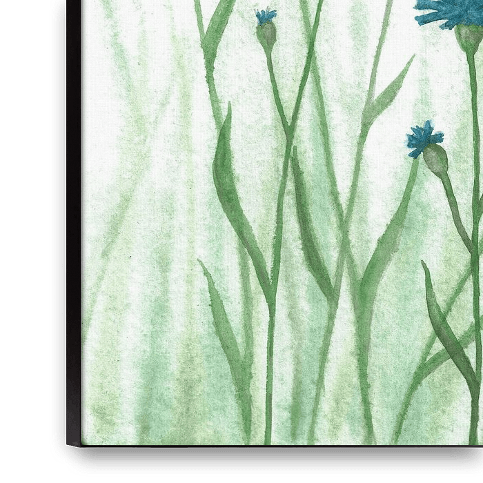 This delicate watercolour shows cornflowers in beautiful blue and green colour gradients