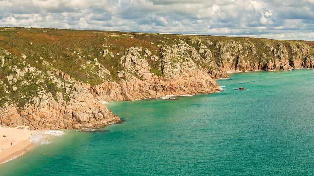 This atmospheric panoramic landscape image shows a picturesque Cornish coastal backdrop with turquoise waters, a gently curving sandy beach and imposing rocky cliffs adorned with lush greenery. The sky is alive with fluffy clouds, adding depth and lightness to the image. In the foreground, a rustic stone building with wooden railings and wild plants frames the scene and invites you to linger.