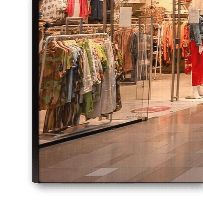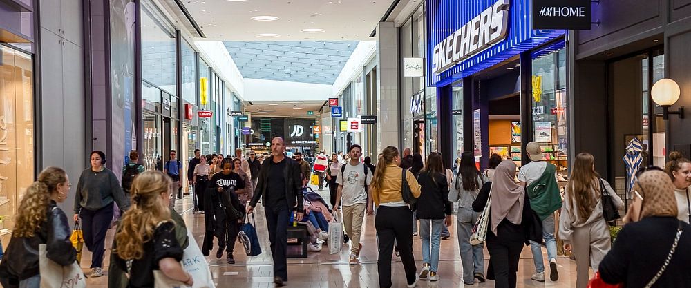 Cinematic panorama colourful indoor shopping mall with quite a few shoppers