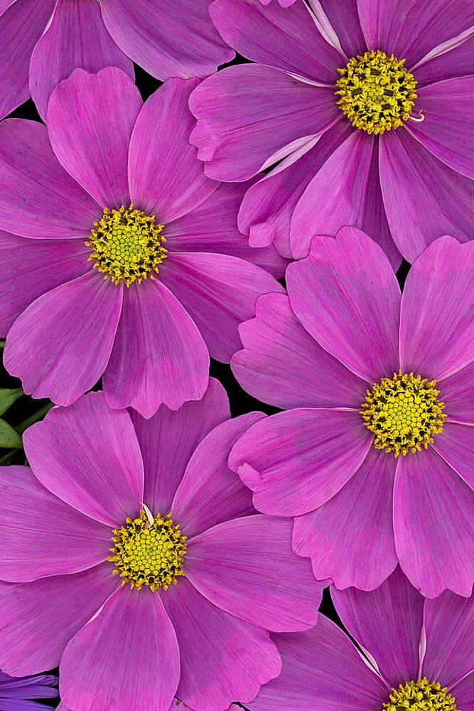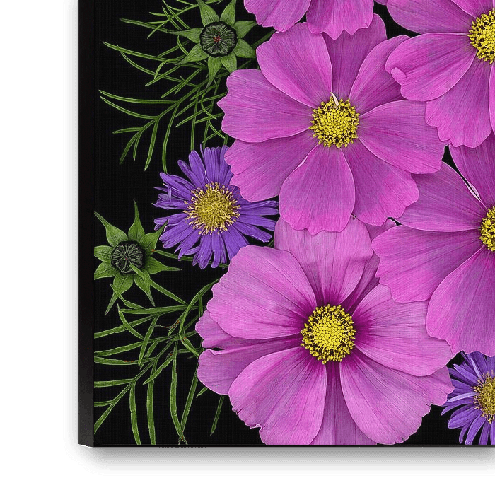 Pink flowering flowers called cosmea sensation and purple chrysanthemums against a black background