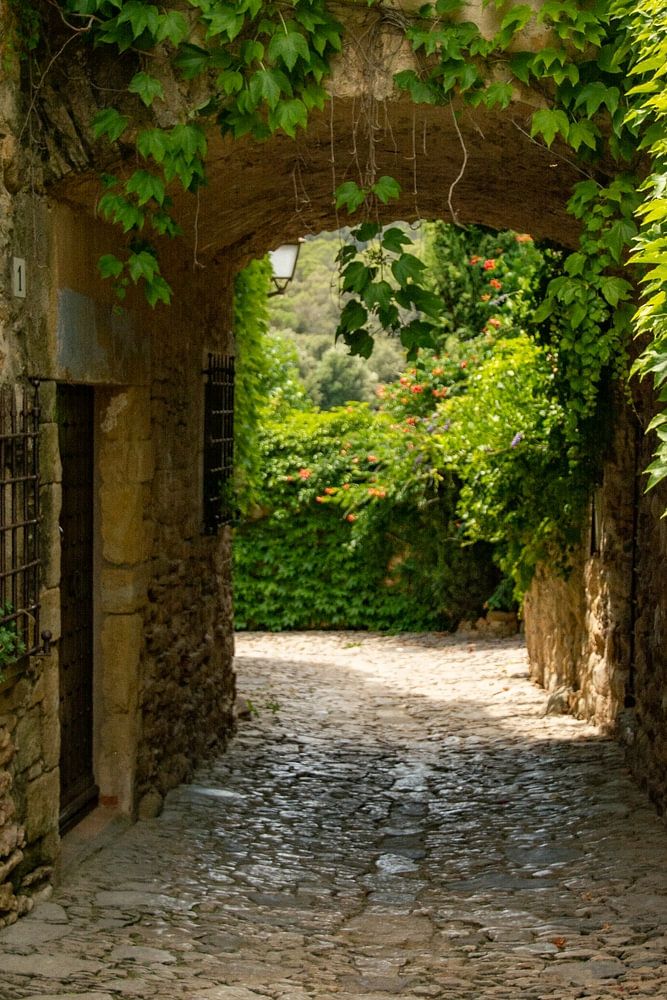 This is the romantic alley in the medieval village Peratallada in the Costa Brava in Catalonia (Spain). It is nicely covered with green wild vine. The pavement is still quite authentic with the stones they found in the area. This is an ideal photo to use as wallpaper.
