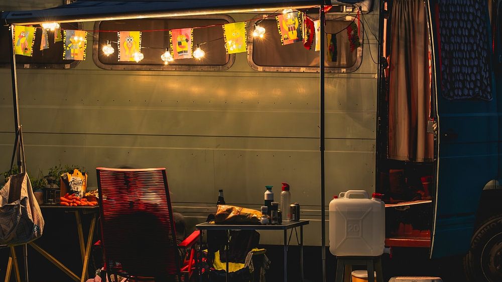As night falls, the soft glow of garlands of lights creates a cosy atmosphere around this charming camper van. Captured in a field, this inviting scene symbolises the freedom and simplicity of life on the road. Every element, from the fold-out chairs to the outdoor cooking utensils, speaks of a spontaneous lifestyle, close to nature. The contrast between the warm lighting and the falling darkness invites stories and togetherness, where night reads with peace and adventure. This image is not only a window into a peaceful evening, but also a representation of a life that chooses to explore and cherish the simple things.