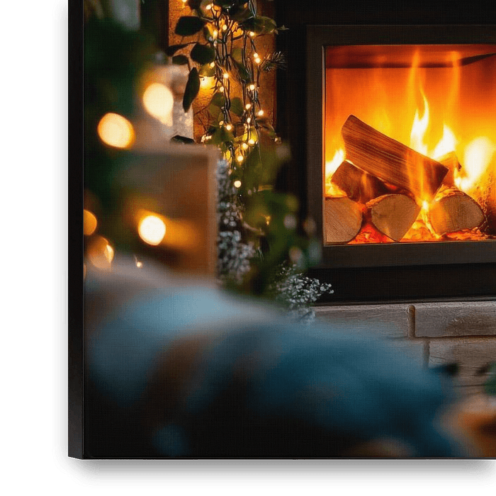 A sparkling play of light frames an inviting fireplace, whose lively flames radiate warmth and cosiness. The delicate lights and green foliage add a festive touch to the scene. This work of art is ideal for the living room, where it creates a cosy atmosphere for relaxing evenings.