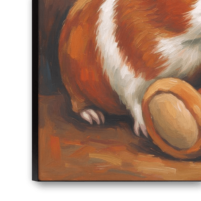 A guinea pig snuggles up close to a plush teddy bear, creating a warm and cosy scene. The background is kept in earthy and warm colours, which further enhances the cosy atmosphere.