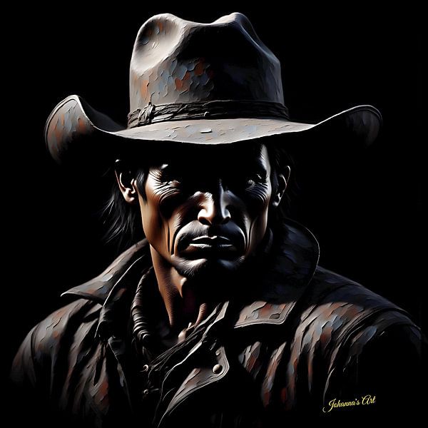 A rugged cowboy stands in stillness, his presence shaped as much by silence as by the harsh landscapes that seem to linger around him. His somber expression is partially concealed beneath the shadow cast by his wide-brimmed hat, yet the downward tilt of his gaze hints at a depth of reflection, perhaps even a quiet burden carried over…