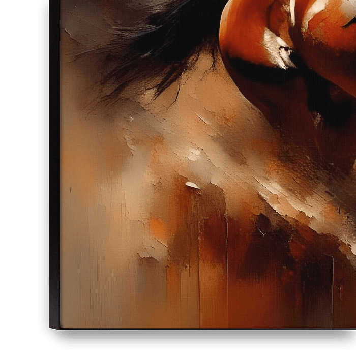 A cowboy rides a galloping horse with skill and determination, hat secured on his head and focus intent forward. The colors are vibrant with a dynamic blend of browns, oranges, and hints of black that suggest a brisk speed and a dust-filled environment.