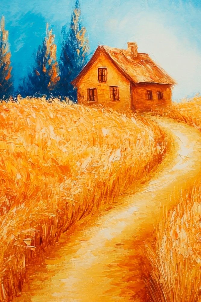 A gentle path winds its way through golden fields that glow in the warm sunlight. A charming yellow house sits alone under a wide blue sky that frames the peaceful solitude. Dense trees to the side add life to the scenery and unexplored secrets waiting to be discovered.