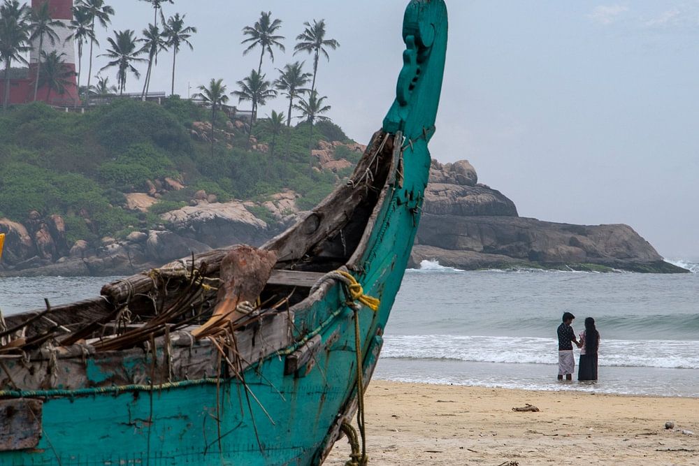 A couple in love take a walk on the beach at Kovalam in Kerala, India. In the foreground, a traditional fishing boat and in the background, Kovalam's iconic lighthouse.
