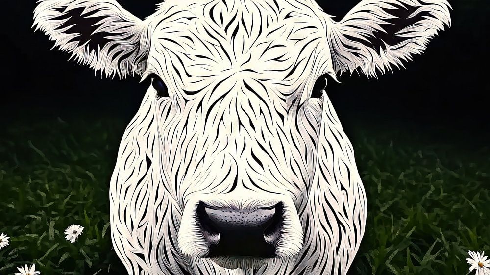 This artistic illustration shows a stylised cow standing in the middle of a lush, green meadow surrounded by blooming daisies. The detailed design emphasises both the elegance of the animal and the natural beauty of the spring landscape. The soft, harmonious colours and fine lines lend the picture a special lightness and aesthetic appeal.