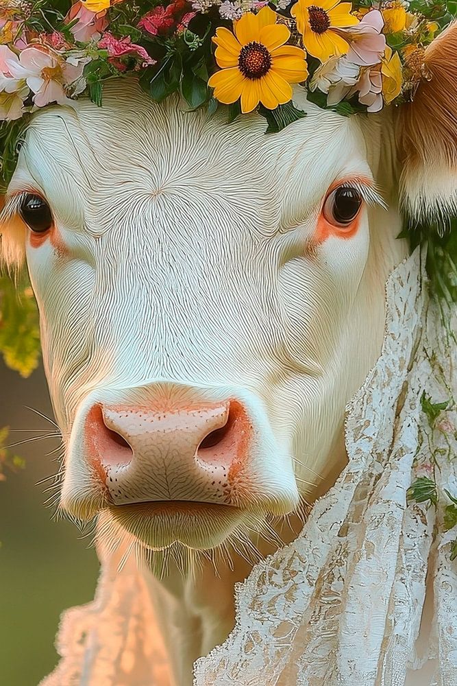 An enchanting, unconventional portrait of a cow, resplendent in a wreath of flowers and a delicate white dress. This mixture of rural idyll and playful elegance creates a cheerful atmosphere. Ideal for a living room, it adds a touch of humour and naturalness to any room. Perfect for animal-loving nostalgics!