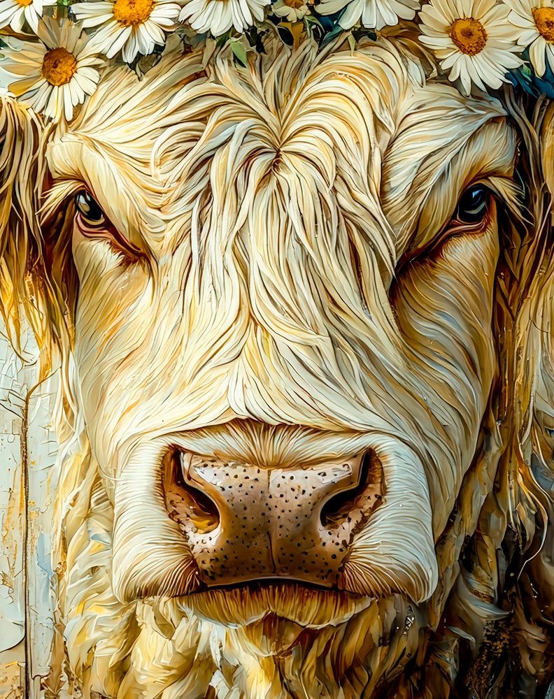 In this picture, a cow appears with soft, almost cream-coloured fur, interspersed with delicate golden tones reminiscent of morning sunlight. Perched on her head is a sweeping wreath of daisies, whose bright white petals form a playful contrast to the subtle beige and honey shades of the coat. The horns act as a natural support for this floral headdress, making the scene reminiscent of a peaceful moment in a quiet meadow.