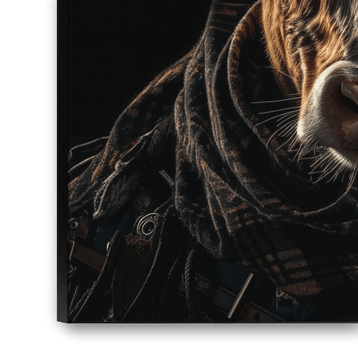Cowboy cow with gun panorama painting that will be a wonderful luxurious addition to any room. With its unique and stylish look, it is a true eye-catcher. The brilliant colours and unusual design make this artwork 100% unique and original. It is the perfect photo print to complete your interior.