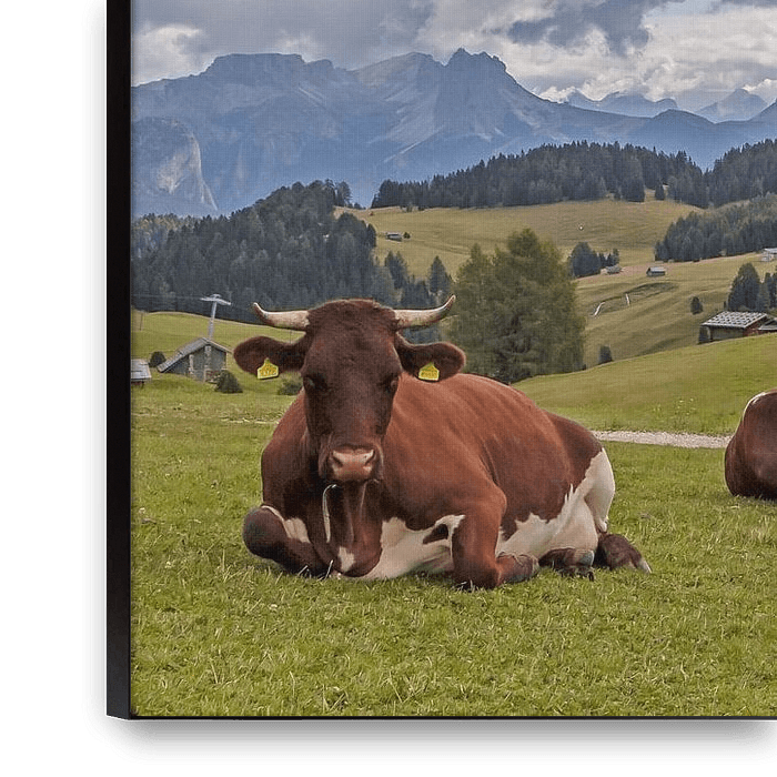 Cows lying on the grass near Alpe di Siusi in the Dolomites. With the mountain Sassolungo in the background. A beautiful alpine meadow for the cows.
