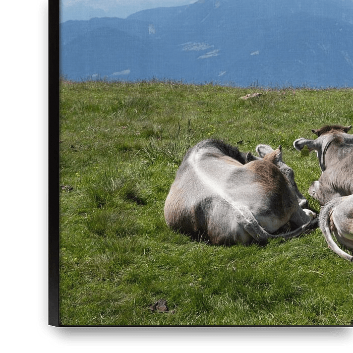 Buy this landscape artwork Cows on the Alm in the Dolomites by Martina Weidner on canvas, ArtFrame, poster and wallpaper, printed on demand in high quality.