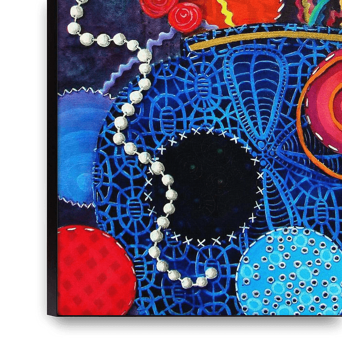 Oil painting from Janny Heinsman's Patchwork series. All "fabrics" are painted, as well as the necklace, needle and thread and buttons.