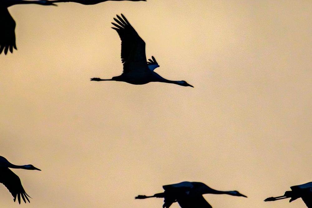 Common Cranes or Eurasian Cranes (Grus Grus) flying in the air near Diepholz in Germany during the autumn migration. Each autumn, thousands of cranes gather around Diepholz, Germany, during their migration from northern Europe to southern wintering grounds. They rest and feed in the region’s wetlands and fields, creating a spectacular natural display. Their calls echo across the landscape as they prepare for the long journey south.
