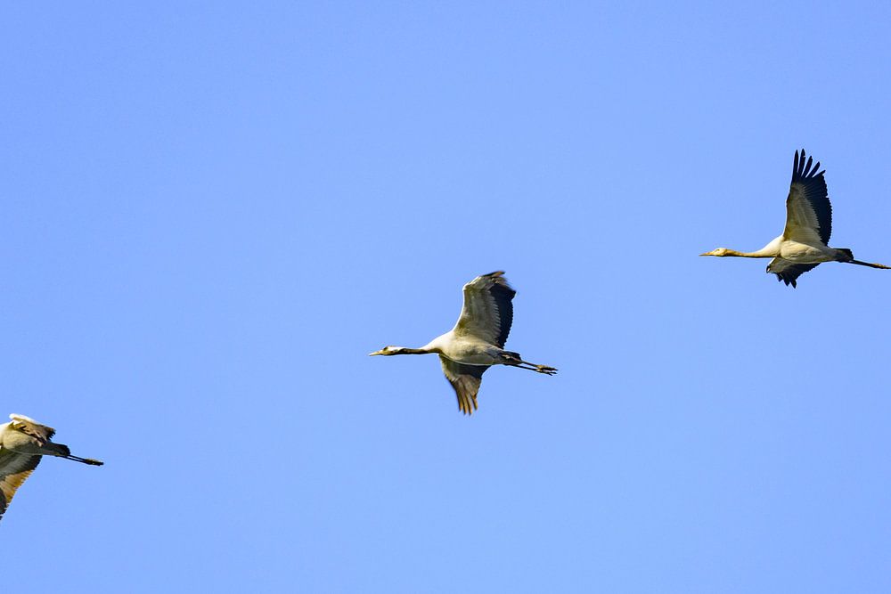 Crane birds or Common Cranes or Eurasian Cranes (Grus Grus) flying in mid air during the autumn migration over the moors of Diepholz in Germany.
