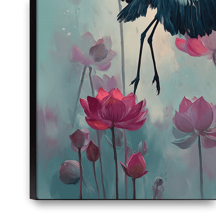 A graceful crane in flight above soft lotus flowers. The combination of movement and tranquillity symbolises balance and elegance. This work brings a sophisticated, almost spiritual atmosphere into the home without being heavy.