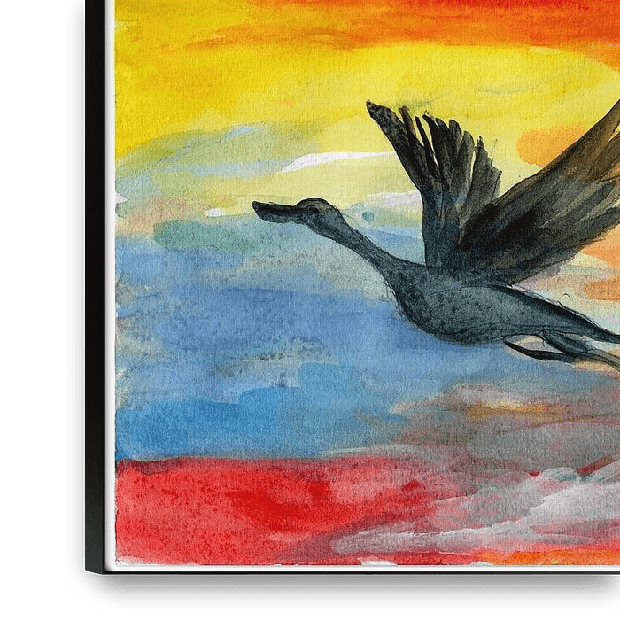 Dynamic, colourful painting of a flock of cranes at sunrise
