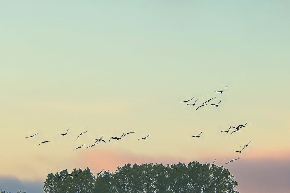 Cranes fly over a forest by Martin Köbsch