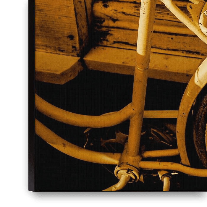 The saddle, fender, and rear rack draw soft curves while the spokes add rhythmic texture. Weathered trim and sunlit boards bring character, and the amber light creates depth and a summery vibe—great for retro,…