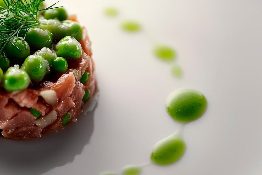 A skilfully arranged plate of fresh peas with a hint of dill conveys pleasure and elegance. The harmonious combination of colours and shapes whets the appetite and creates an inviting atmosphere. This masterpiece is ideal for the kitchen or dining room, where it provides culinary inspiration and stylish flair.