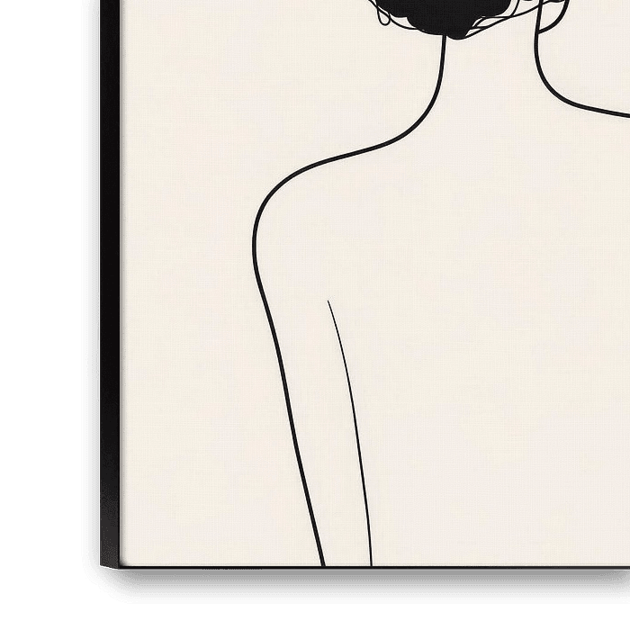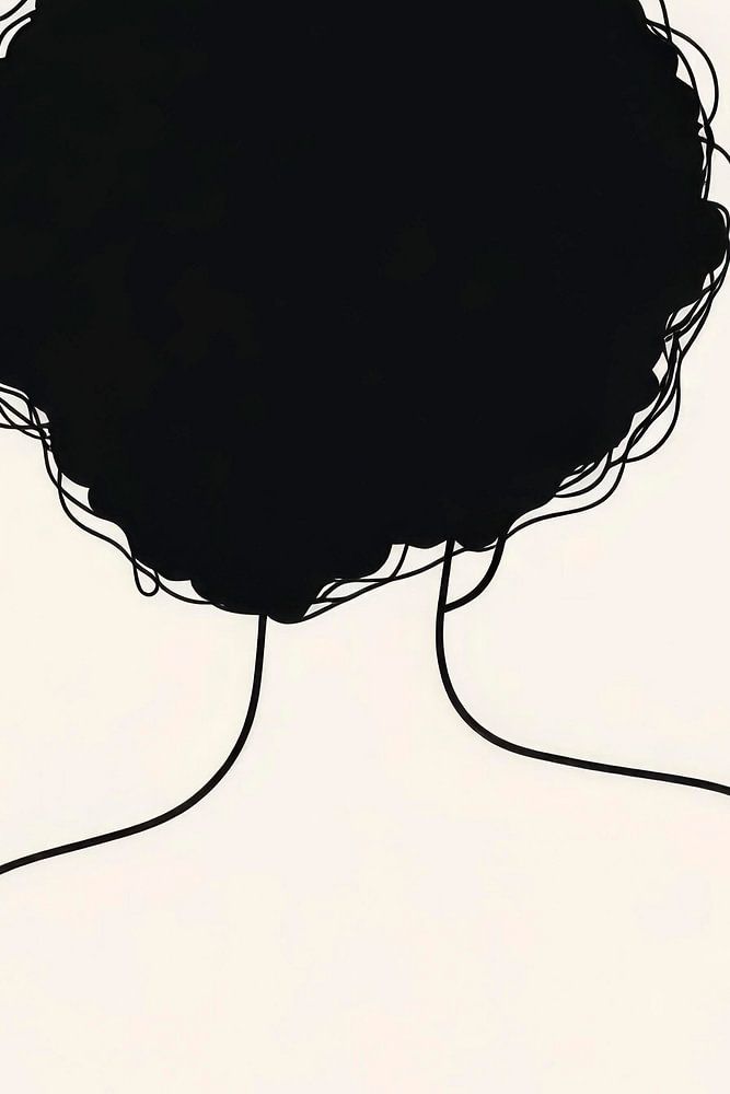 The image shows a stylised depiction of a rear, naked body with voluminous, curly black hair. The clean lines emphasise the elegant curves of the body, while the contrast between skin and hair creates a strong visual focus. The minimalist composition conveys both grace and enigmatic intimacy.