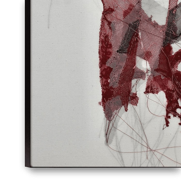 'Crescendo Rosso', from the series Crescendo. A figurative textile work of a woman. Brown & red thread, grey, red & black tulle have been used.