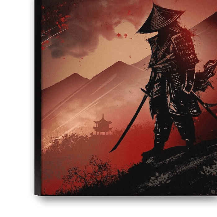 A stoic samurai stands on a hill against a brooding, blood-red sky and a dark moon. The monochromatic, brush-stroke style emphasizes the warrior's dark armor and the raw, violent atmosphere.