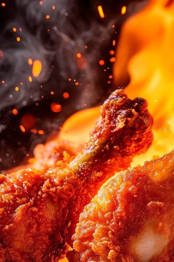 Crispy chicken thighs, glowing flames and a hint of smoke give this picture an exciting, culinary dynamic. The bold colours and explosive composition immediately attract attention and make it the ideal eye-catcher for a modern kitchen. A real statement for passionate cookery lovers!