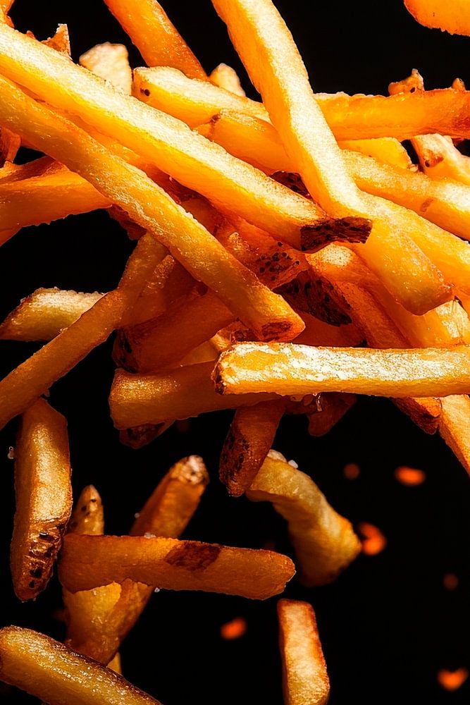 Crispy, golden-brown fries seem to dance weightlessly through the air, their deliciousness promising an indulgent experience. The deep black backdrop lets the vibrant colours shine and awakens appetite and anticipation. This picture is perfect for the kitchen or dining room, where culinary delights take centre stage.