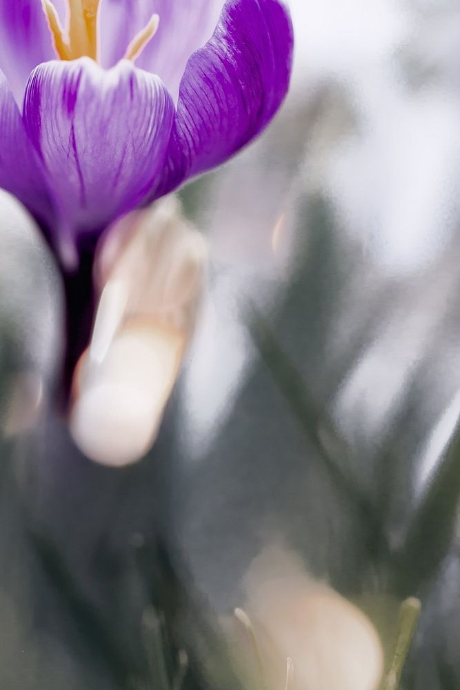 A beautiful purple crocus photographed in the shade. A few lights add a touch of magic to the scene. Spring is on its way!