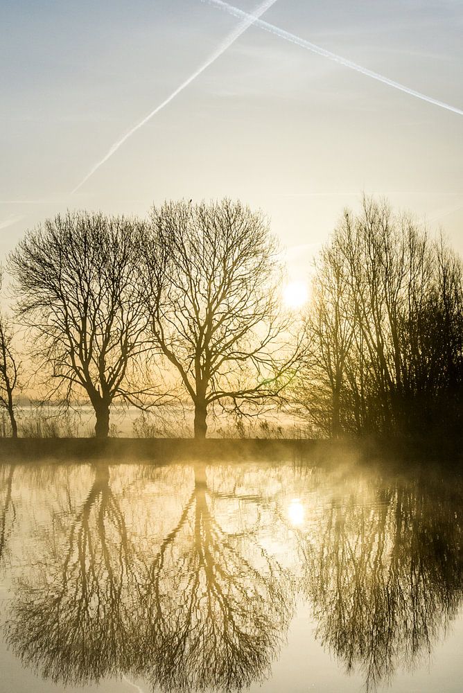 Cross-shaped reflection of aircraft stripes above a misty river Amstel in Amsterdam