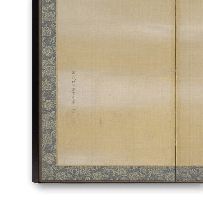 In these screens, a clump of young bamboo and a gnarled plum tree beside a stream provide the setting for a group of crows in flight and at rest. Soft washes of gray ink and gold convey the feeling of dense fog and evoke a sense of deep space. Nine birds are boldly rendered in thick, textured brushstrokes in varying tones of gray and black, achieved by laying down the ink with the side of the brush. Painted when Okyo was thirty-three years old, these screens demonstrate a free ink style that is rarely found in works of his youth. However, the startling realism of these cawing birds, and the detailed observation of natural form, are characteristic of Okyo’s style.