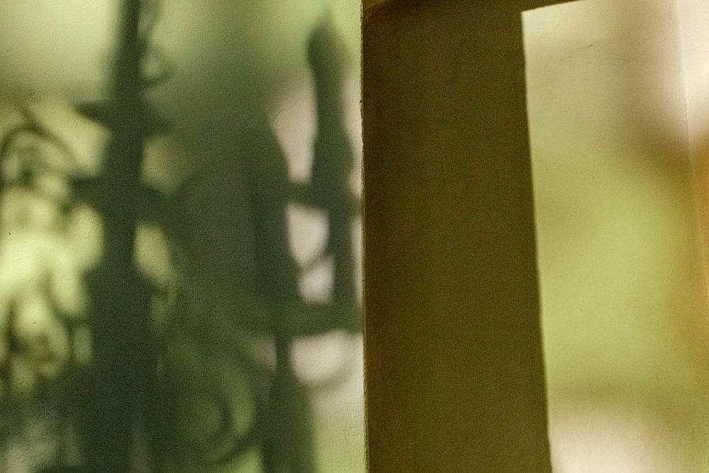 A crucifix in a niche in St Lambert's church in Vught. Yellow and green the silhouettes of a chandelier. The light on the white walls is coloured by stained-glass windows. A beautiful religious vista on the wall.