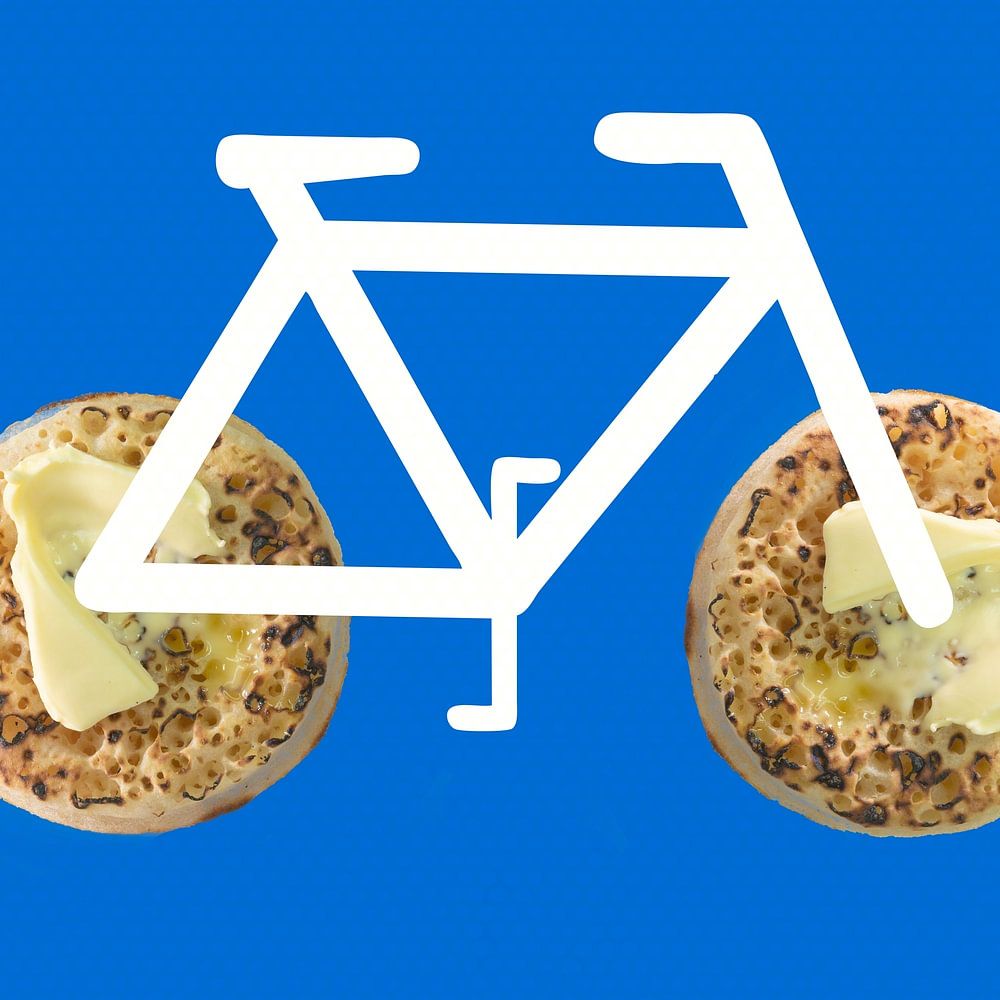 Crumpets - UK comfort food. As in spend Saturday playing down the park in the driving rain and getting covered in mud. Come home to the football scores and hot crumpets. Cycle sign with crumpet wheels. Animation available.