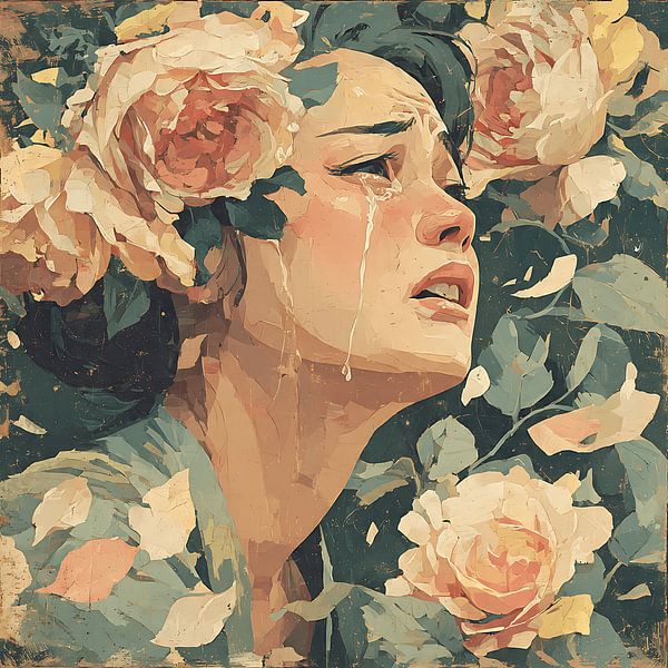 A surreal digital art illustration of a woman crying, her tears turning into blooming roses from her head. Featuring painterly brush strokes, soft muted vintage colors, whimsical and emotional dreamscape. Perfect wall art for adding a touch of melancholy and surreal elegance to your space. Stylized, non-photorealistic, and full of…