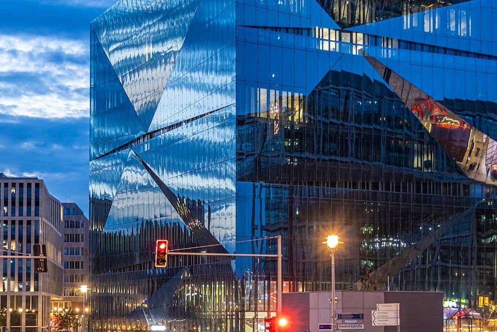 The modern office building Cube Berlin on Washingtonplatz square at dusk, Berlin, Germany | Smart Commercial Building Cube Berlin on Washingtonplatz square at dusk, Berlin, Germany