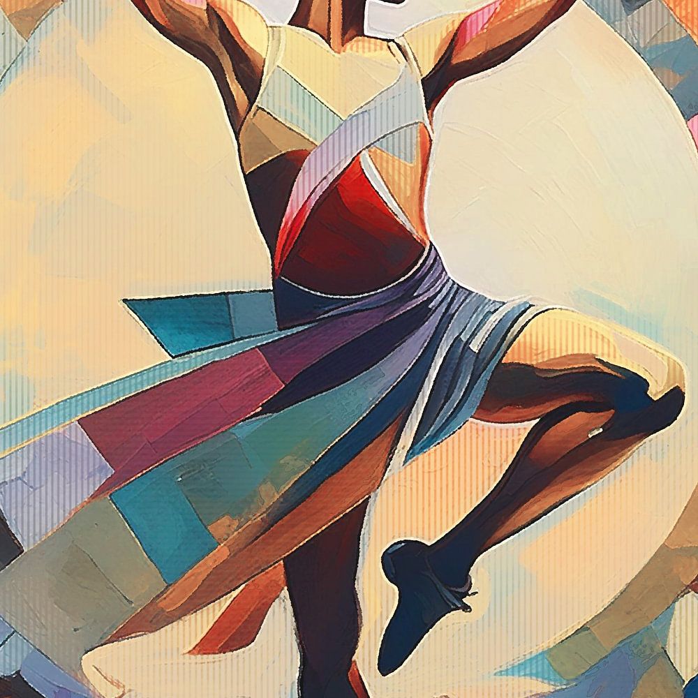 A colourful and cubist work of art. This dancer stands at the centre of a colourful spiral with cubic objects.