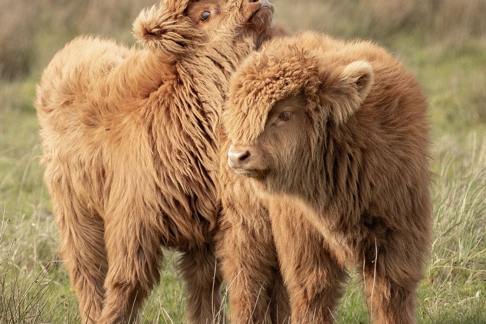 Cute and sweet this cuddling and playing duo. These calves of the Scottish Highlander breed are cute and tough at the same time. This tough breed is good-natured and with their dense fur, they are robust. You can keep looking at this cute duo, can't you? The photo was taken at Hijkerveld in Drenthe in April 2024.
