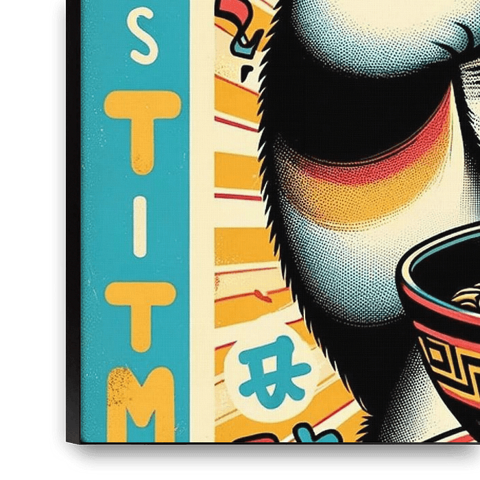 In a charming and lively depiction, this picture shows a cat eating a bowl of ramen with relish. The chopsticks, held in her paws, dip deep into the steaming bowl, and her closed eyes signal pure contentment. She is surrounded by vibrant colours and typographic elements reminiscent of both traditional Japanese lettering and modern pop…