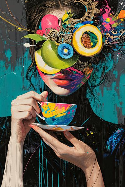 Cup of Hapiness - This surrealist painting shows a woman with a colourful, masked face composed of fruit, flowers and mechanical elements, while carefully holding an equally vividly coloured cup of tea.