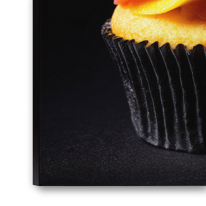 The dark background highlights the rich colours of the pastry and creates a sophisticated contrast that adds depth and character to the composition. This makes the cupcake seem almost detached from the canvas, giving the work a modern, almost photographic quality. The refined details in the glaze and texture of the pastry bring a sense of realism, while the abstract colour gradient gives the artwork an artistic and expressive character.
