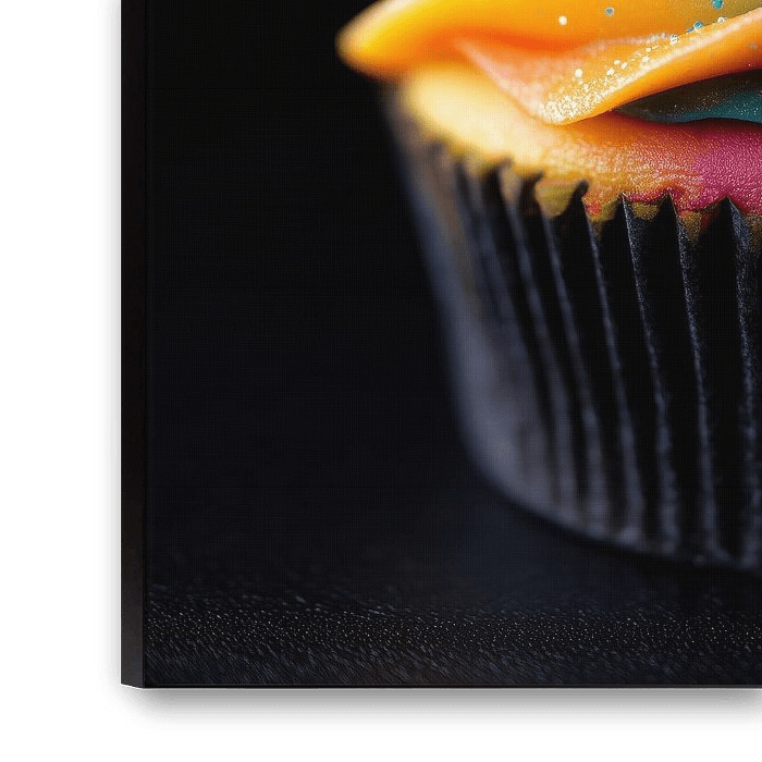 The black background provides a powerful contrast that highlights the colours and adds depth to the cupcake. This gives the painting a modern and luxurious look, perfect for interiors that like to add a subtle accent of colour and elegance. The interplay of light and shadow enhances the sense of depth, making the pastry seem almost tangible.