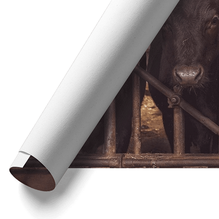In a moment of curiosity and innocence, the calves form a lively scene in the rustic stable. Flanked by rough walls and illuminated by a warm glow of the spring sun, they stand in a perfect row, their heads bowed in an inviting pose of genuine interest.