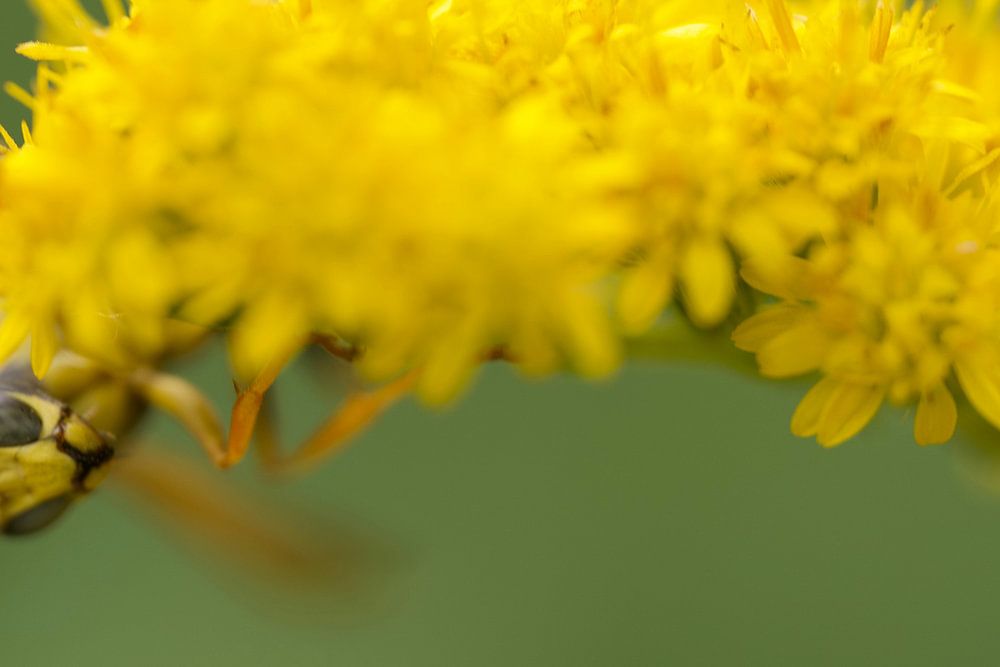 A wasp-like looking for tasty nectar. Beautiful as the yellow shades stand out from the green!