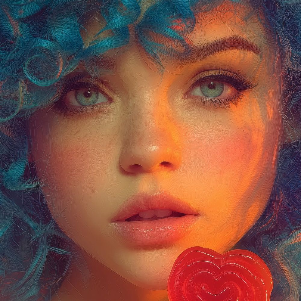 The red heart lollipop in her hand becomes the central element of the composition. It symbolises childishness and innocence, but also sweet temptation and first love. The way she holds it - almost hesitantly, as if she is weighing up an important moment - adds a deeper emotional level to the picture. The background melts into soft pastel colours and makes the portrait look like a dream.